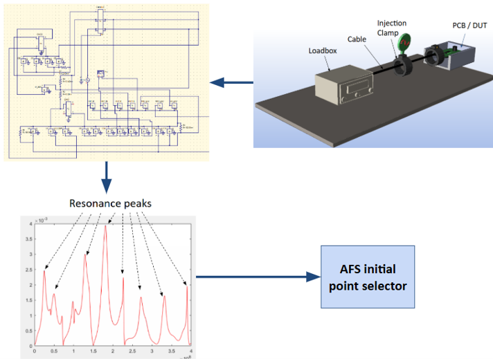 To account for the combined effects of all these elements, a circuit-level simulation is performed, emulating the complete EMI test setup—including the PCB, connected cables, and the LISN (Line Impedance Stabilization Network). This simulation helps to locate the resonance peaks across the frequency spectrum, more accurately in the low to mid frequency region a priori. These frequencies are fed as initial points to the AFS algorithm.
