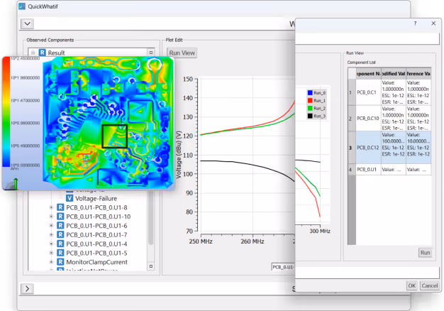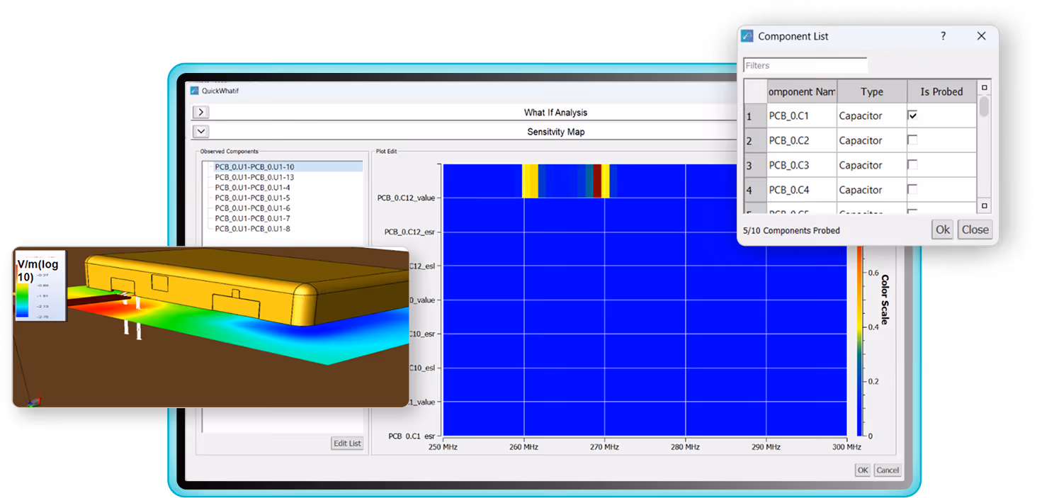 Generates granular sensitivity maps that quantify the relative impact of individual PCB components on induced voltages across a frequency sweep. Engineers can virtually swap component values and immediately see the impact on the emission/immunity profile without running a full re-simulation.